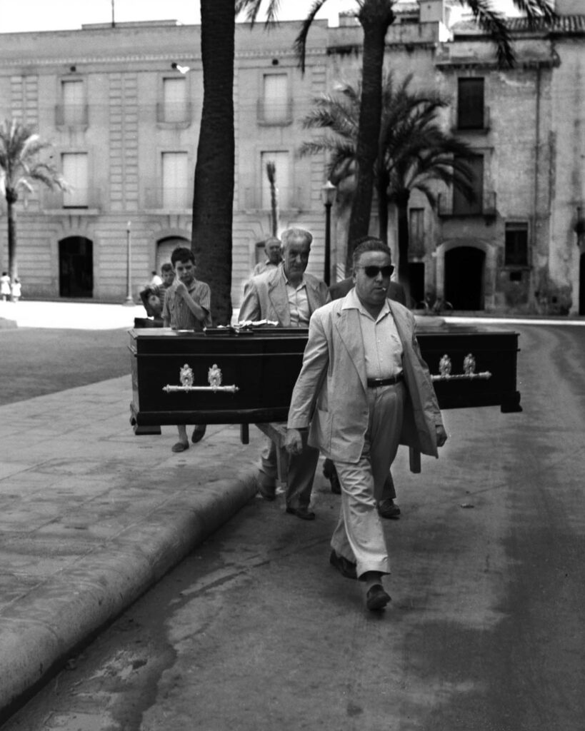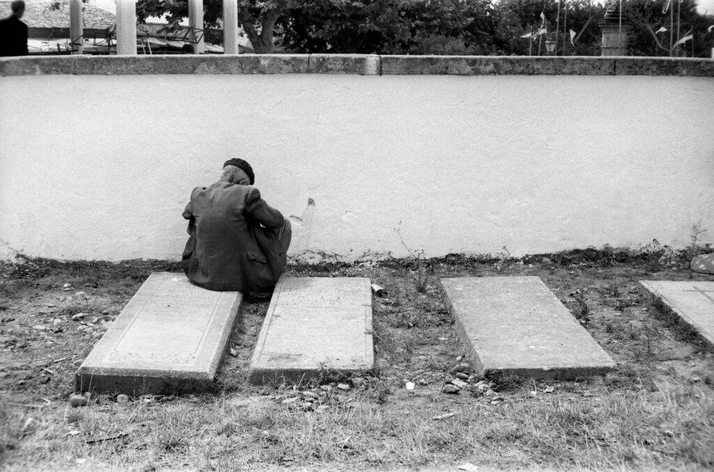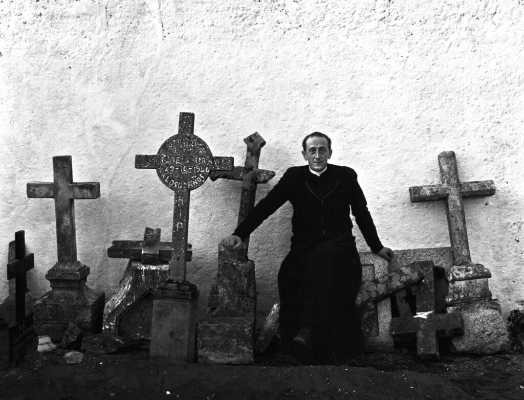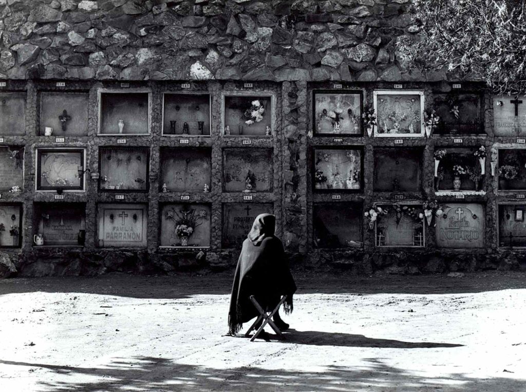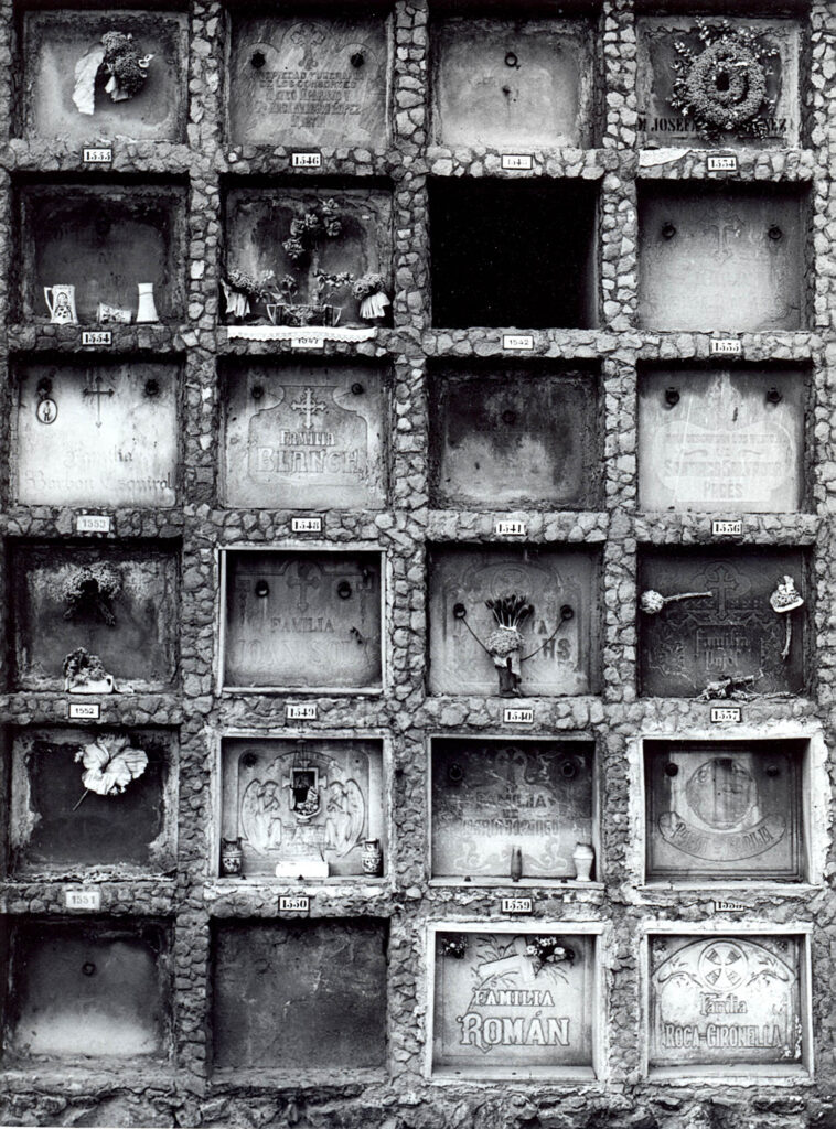 La muerte, como final y decadencia, fue el tema preferido de Ricard Terré. No siempre la trató de forma lúgubre. La abordó con ironía, que era su modo de enfrentar lo grave. En Barcelona fotografió las tumbas de Montjuïc, rompiendo el tabú con primeros planos de nichos a plena luz donde podían leerse los nombres. Opuesto a la visión romántica del cementerio al atardecer, su gesto fue una provocación. La cercanía de la muerte abría la puerta a lo trascendente y quebraba seguridades.